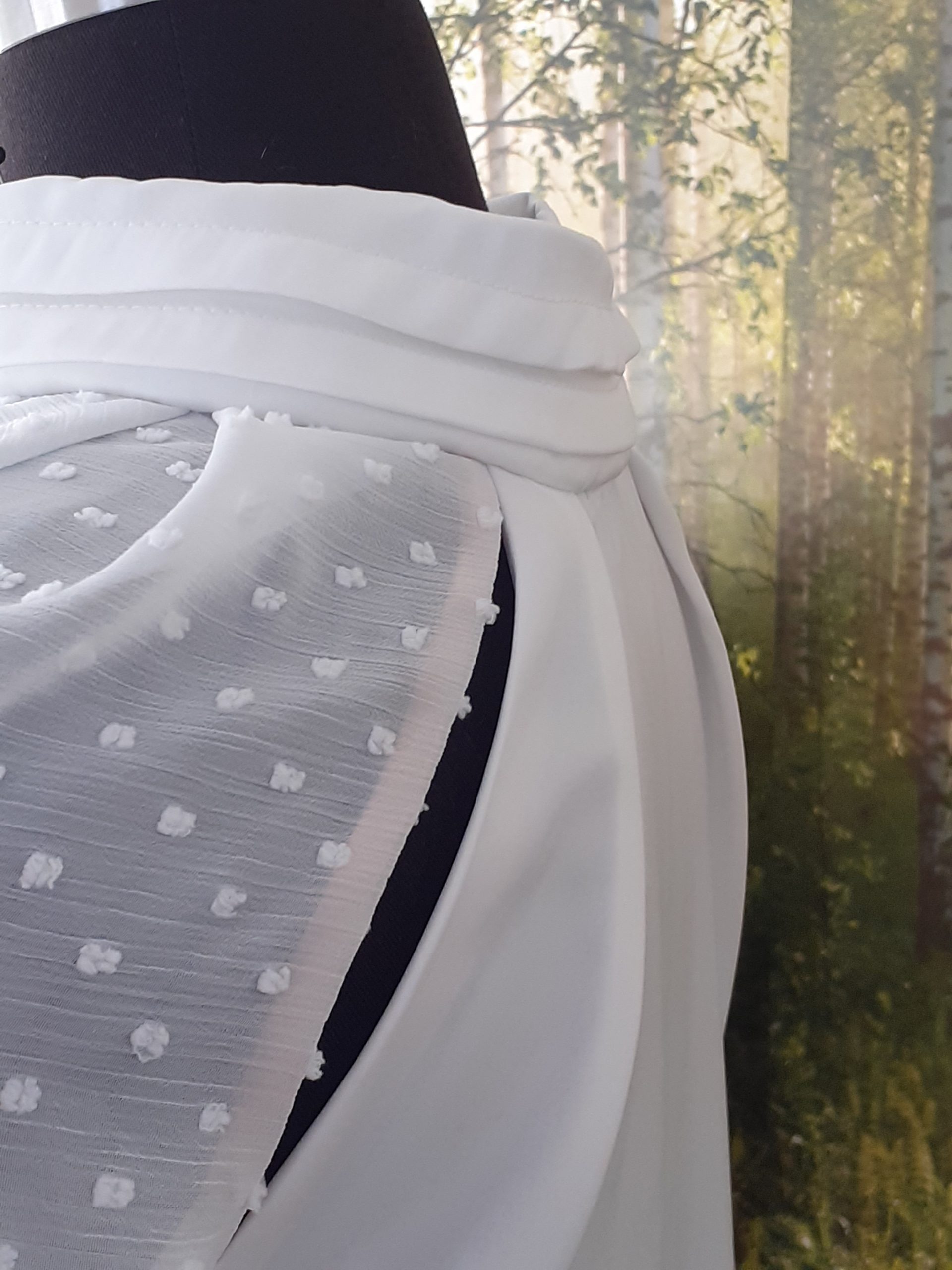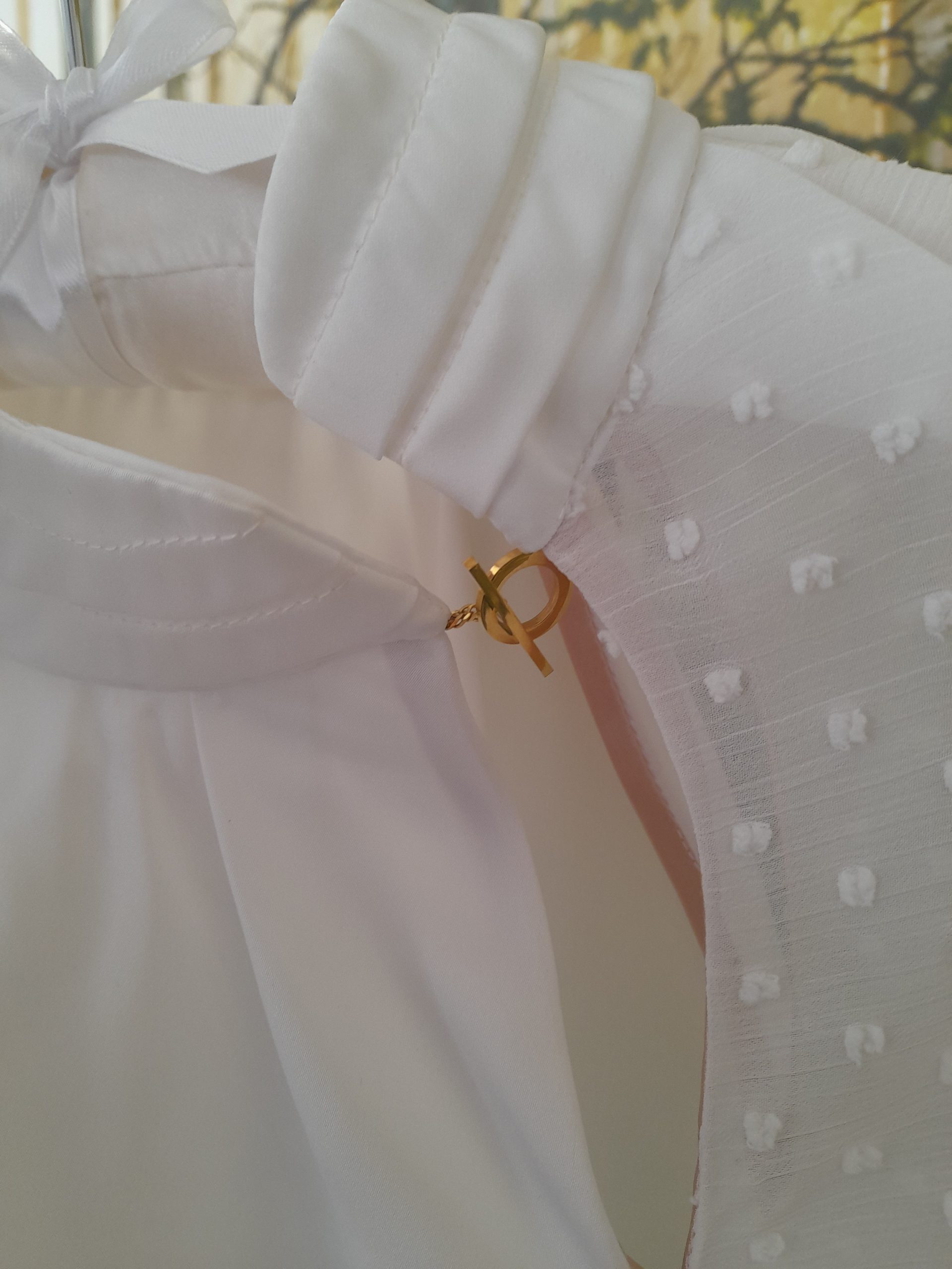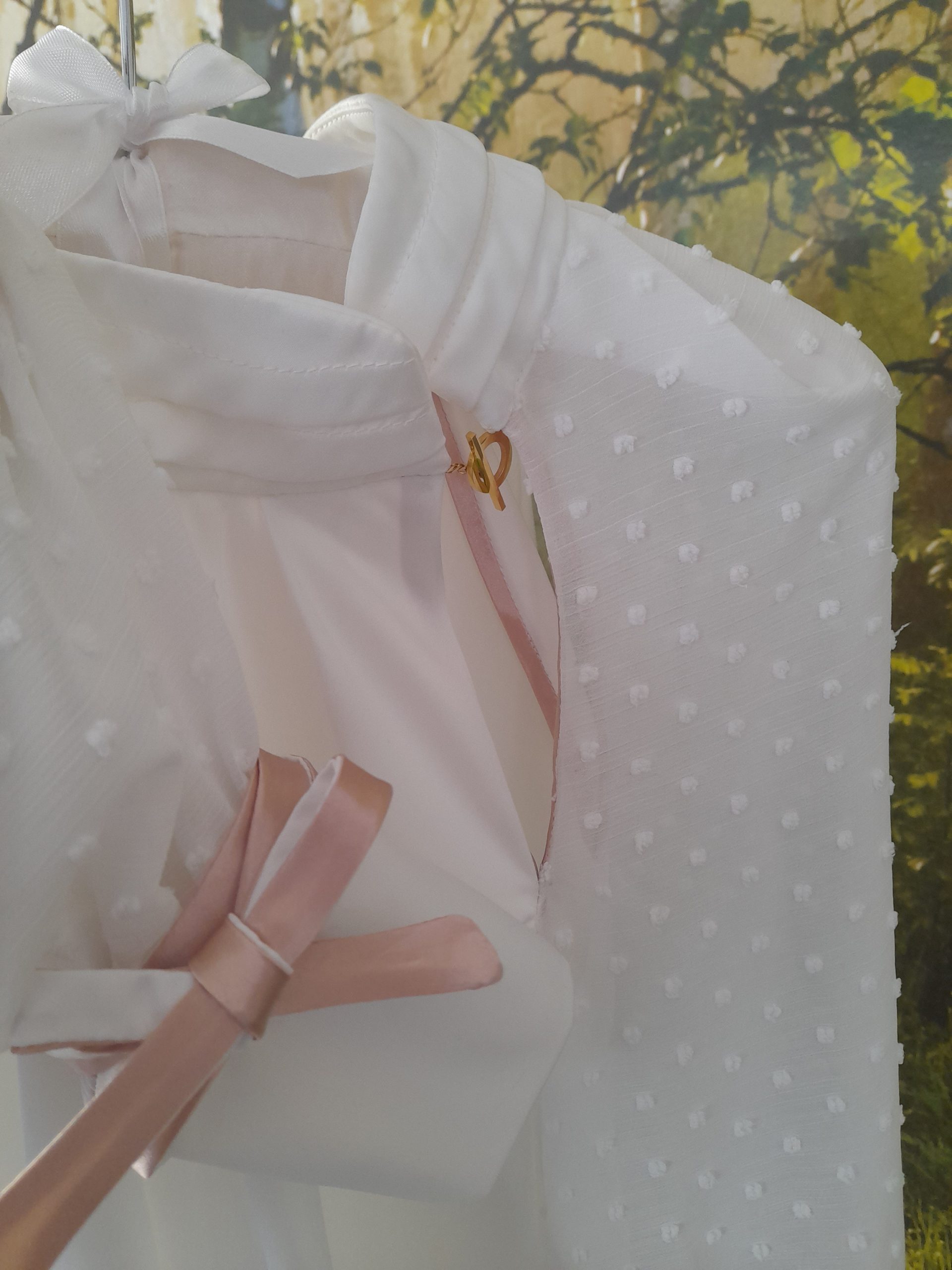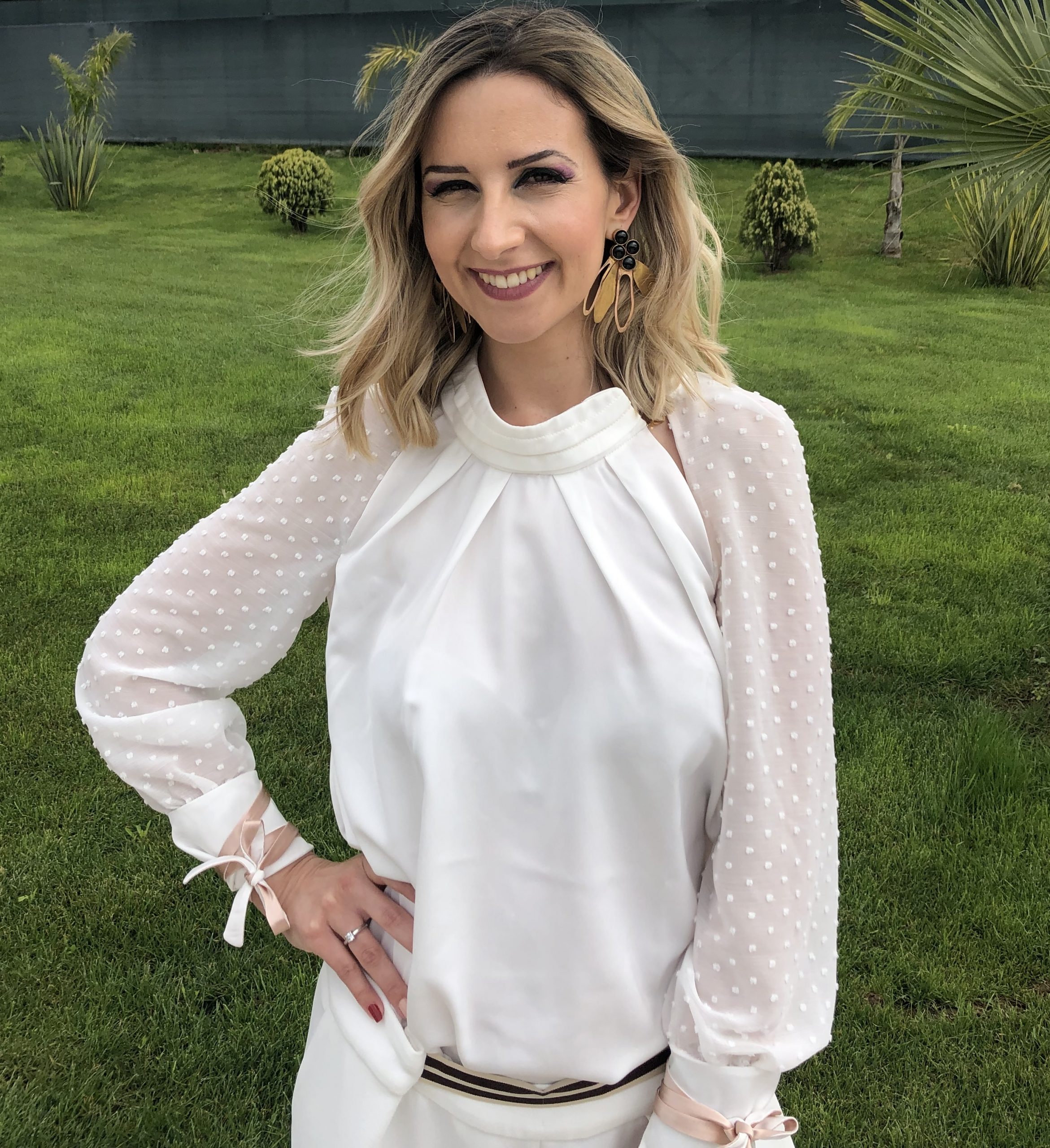 Quando a roupa se torna muito mais que uma junção de tecidos, ela adquire o poder de nos transformar e sonhar… O nosso sorriso fica mais bonito quando vestimos a nossa personalidade! A delicadeza, a doçura, a sofisticação e a feminilidade eram algo que queria que essa peça representasse… Para representar a delicadeza decidi optar pelos brancos, brincando com diferentes texturas! Juntei o toque da viscose para o sofisticado, a transparência do chiffon com relevo, para o feminino e o cetim rosa em apontamentos para a doçura. A aplicação em aço dourado dá à peça o luxo, por ser única no Mundo! Não houve dúvidas quanto ao nome e Identidade desta peça… Nascia assim a ideia para a Blusa “Sweet”. Já imaginaste se fosses tu a vestir esta blusa? Qual seria a sensação?