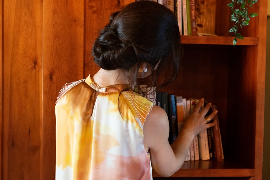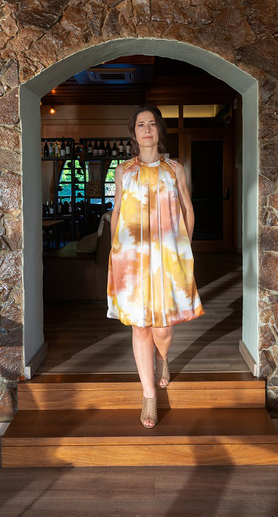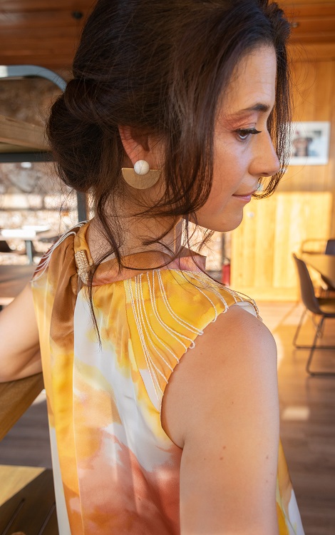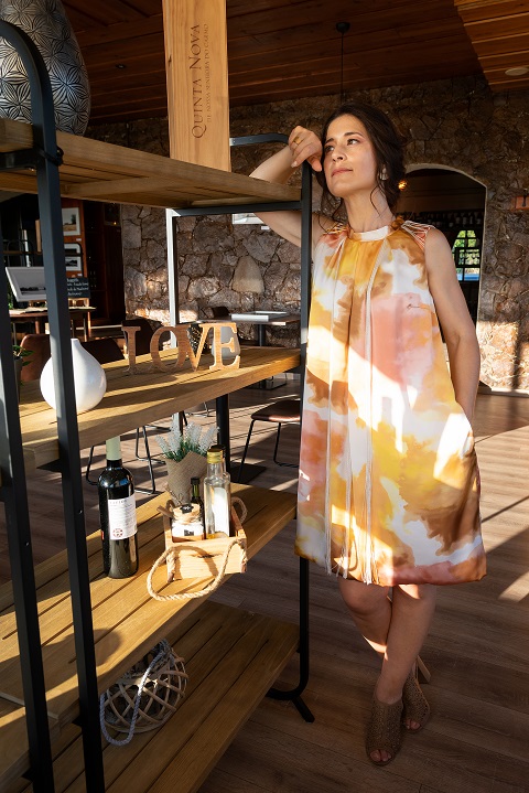 – Vestido curto estampado, decote redondo com pregas e com aplicação de fios de algodão seda. Contém bolsos. Abertura nas costas. Efeito balão. (Cinto apenas demonstrativo para efeito cintado).